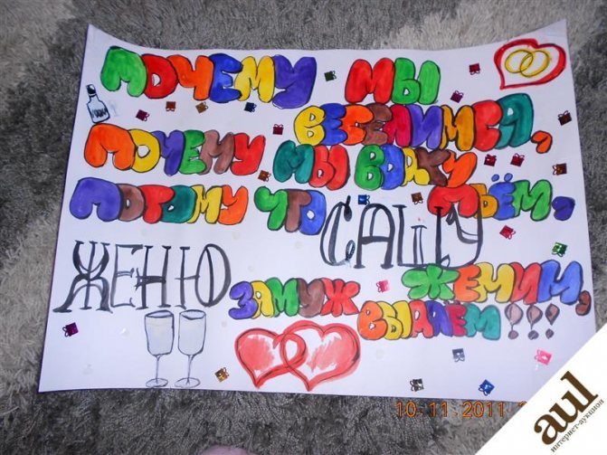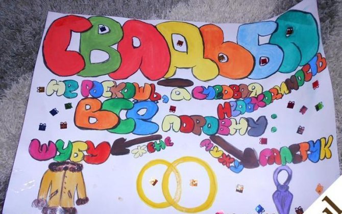 В настоящее время в магазинах представлен широкий ассортимент плакатов. Их можно приобрести в свободном доступе по достаточно низкой цене. Но всего лишь лет 10 назад такого многообразия не было, поэтому все подруги невесты рисовали плакаты самостоятельно.