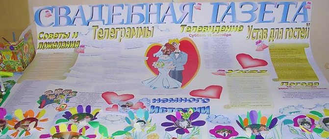 Тема украшения стенгазетами собственного изготовления также актуальна для украшения банкетного зала. Гостям будет интересно узнать историю возникновения любви между молодыми. Для этого как нельзя лучше подойдёт плакат с применением фото пары. Часто такие баннеры рассказывают о женихе и невесте, начиная с самого детства.