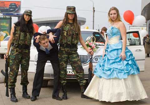 Такая тематика подходит для женихов, которые служили в армии, или являются военнослужащими и уважают военные традиции. Свидетельнице и подружкам необходимо нарядиться в военную форму и при встрече жениха провести ему курс молодого бойца, чтобы убедиться в годности жениха к семейной жизни.