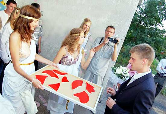Например, возьмём передачу для знатоков «Что? Где? Когда?» Знатоками будут выступать жених и его свита, а вопросы будут от родственников молодой. Обязательно включите музыкальную паузу и помощь магистров, которыми могут стать тёща, тесть и бабушка. Вопросы могут быть от бабушки, сестры или брата молодой, тёти, дяди, мамы, папы и т.д.