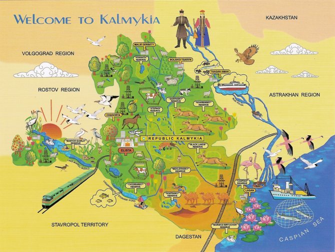 Природа у нас гармоничная, степи весной усыпаны красными тюльпанами, протекает длинная река Волга, имеются небольшие озера и на востоке омывается Каспийским морем, где цветут волшебно красивые лотосы. Народ в Калмыкии самый простой, но гордый. Перенесший войну и геноцид. Если вы никогда не были у нас, будем рады вашему визиту. Уверена вам понравится наш колоритный и гостеприимный городок, своей простотой и красотой, наша степная жемчужина — город Элиста. Приехав к нам вы окунетесь в экзотический город, с не менее экзотичным народом для России. В котором находится множество достопримечательностей, Шахматный городок, интересные памятники.